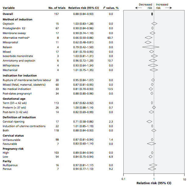 “4 methods were associated with a significant reduction in risk of cesarean delivery: prostaglandin E2 (RR 0.90, 95% CI 0.84– 0.96; I 2 = 0%), misoprostol (RR 0.62, 95% CI 0.48–0.81; I2 = 0%), alternative method (RR 0.66, 95% CI 0.50–0.86; I 2 = 60.7%) and mixed method (RR 0.81, 95% CI 0.70–0.95; I 2 = 0%).”